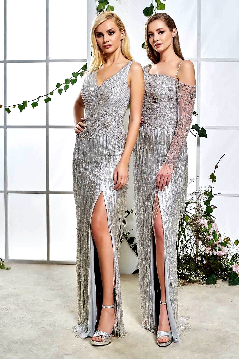 Yırtmaçlı Gri Taşlı Uzun Abiye Elbise