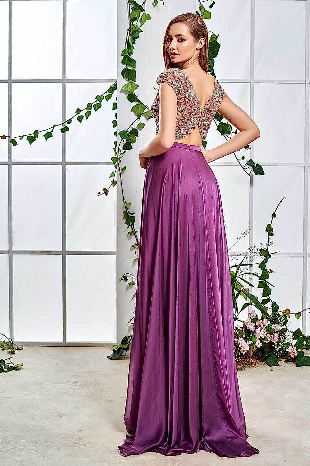 Taş İşlemeli Transparan Mor Uzun Gece Elbisesi