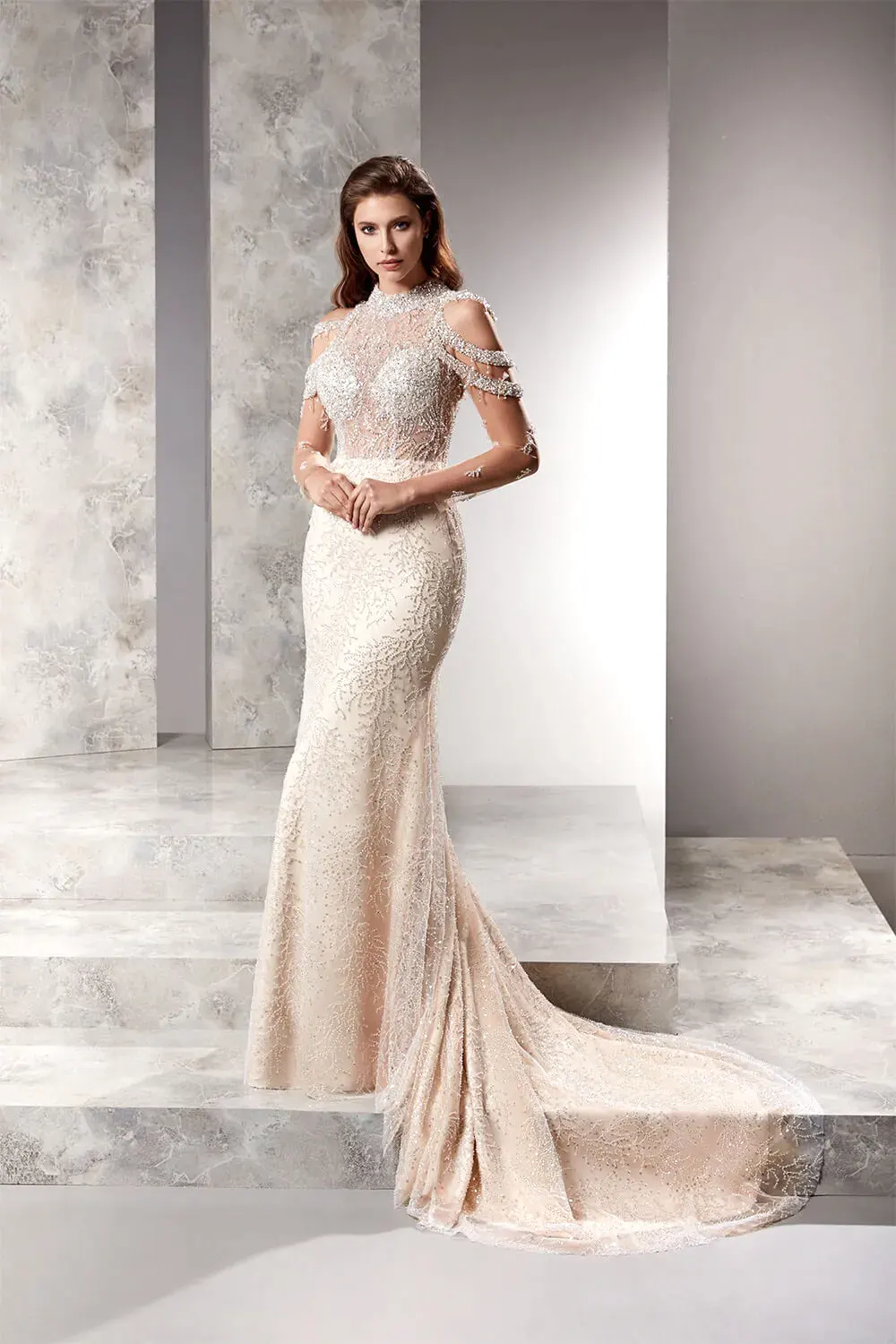 Belden kuyruklu Halter Yaka Omuz Sarkaçlı Kristal İşleme Balık Gelinlik