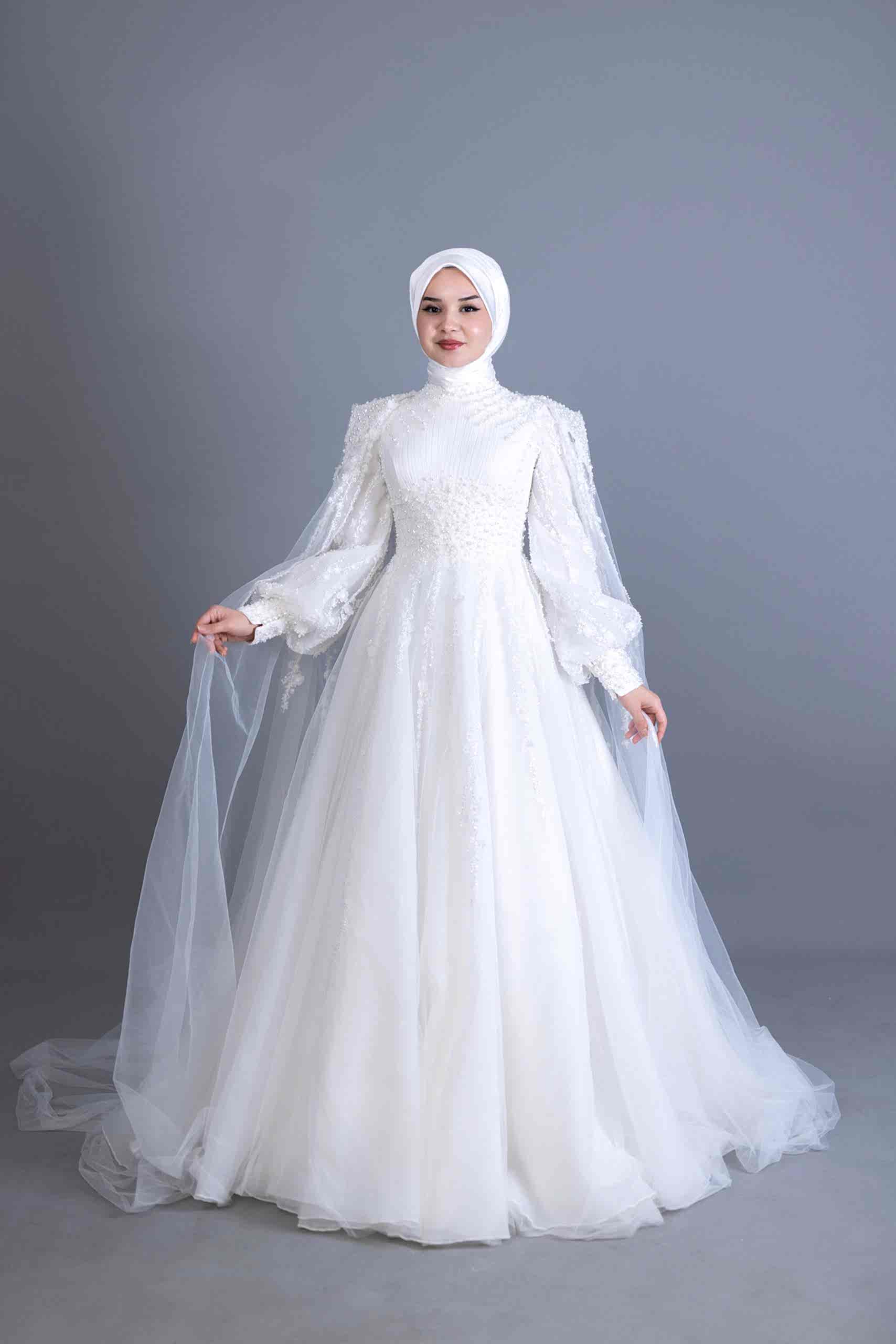 Çıkarılabilir Pelerinli Balon Kol Detaylı Tesettür Gelinlik
