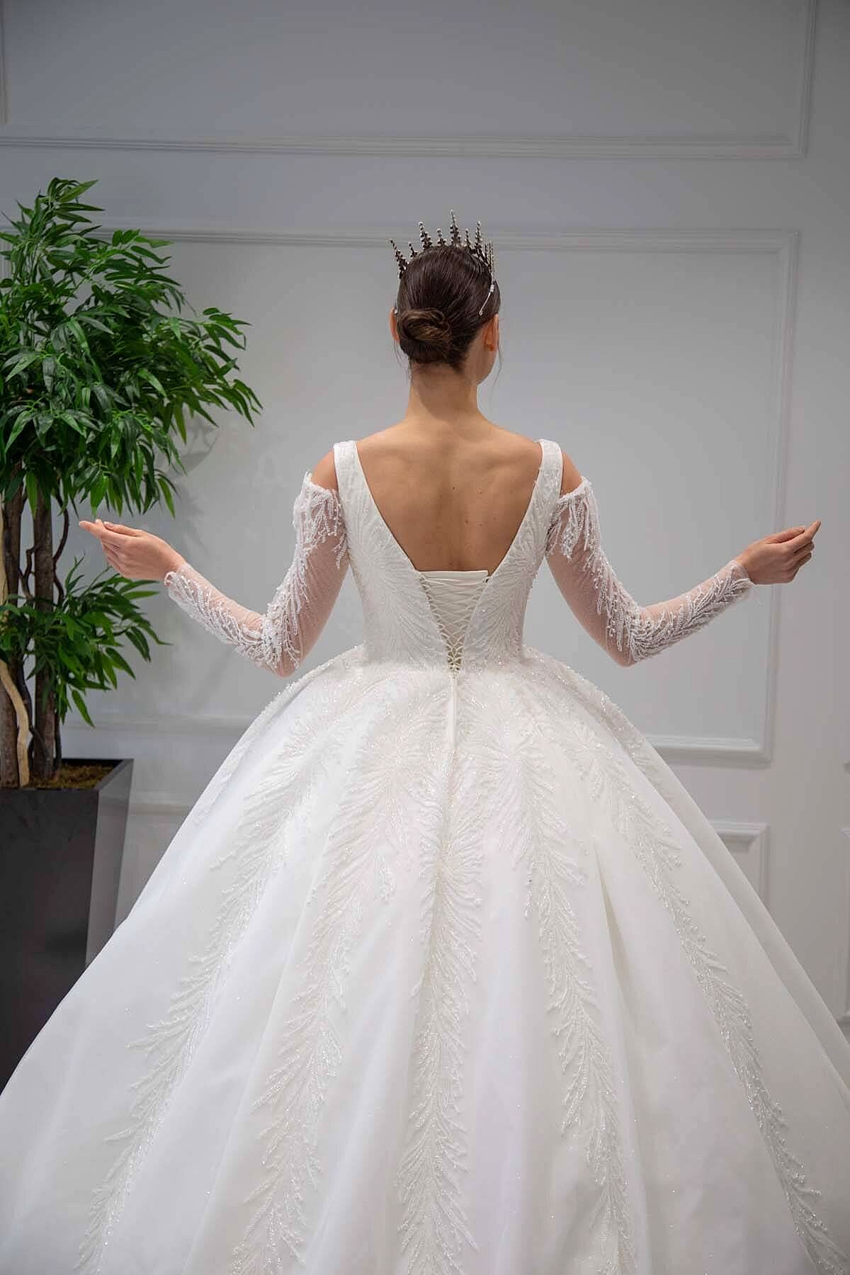 Dantel İşlemeli Uzun Kollu Prenses Gelinlik