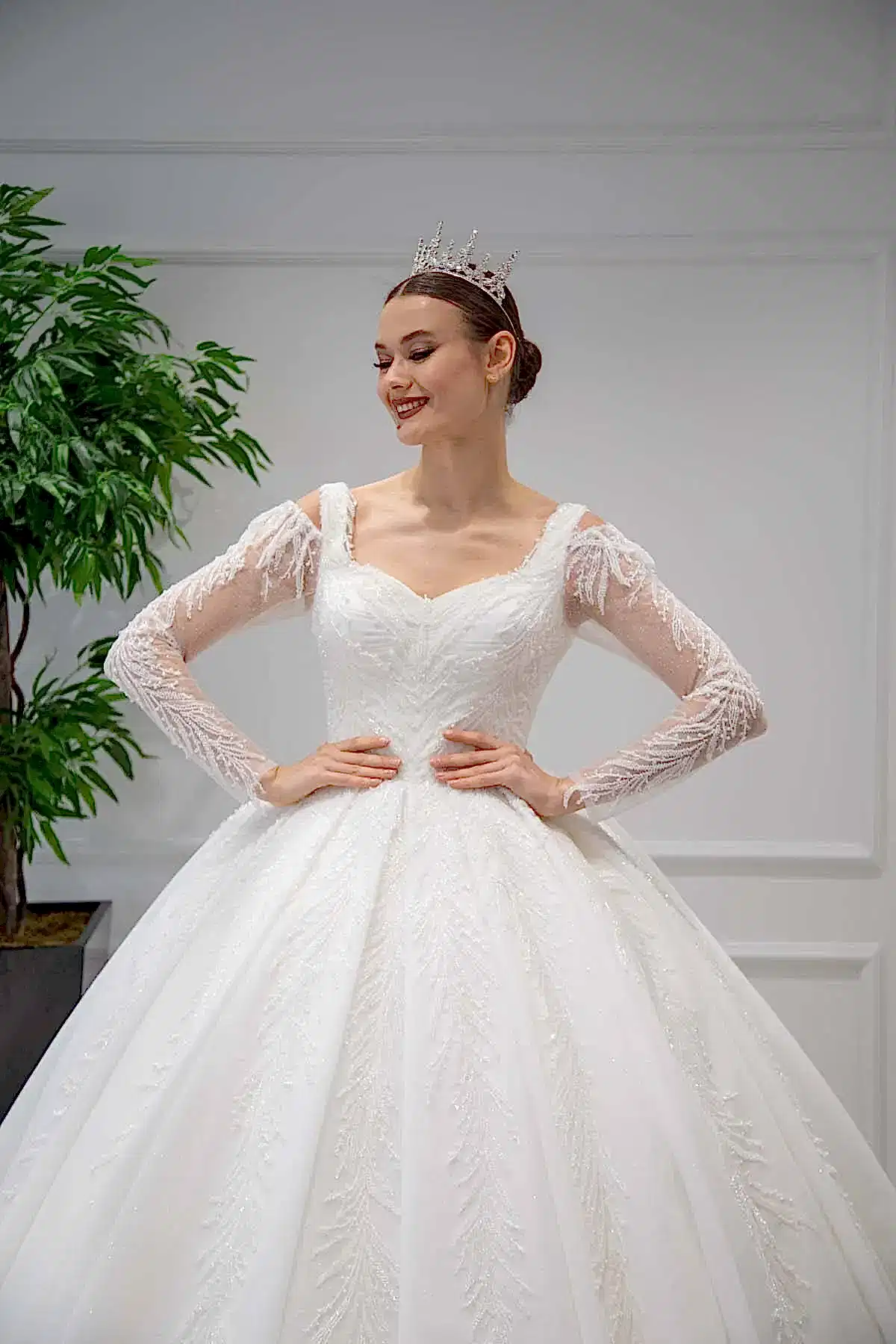 Dantel İşlemeli Uzun Kollu Prenses Gelinlik:27+ yıllık tecrübemiz ve binlerce model zarafetiyle, her detayda özen ve ustalık barındıran bu eşsiz tasarım, ölçülerinize özel işçilikle hayalinizdeki anlara eşlik ediyor. Müşteri desteğimiz ve taksitli ödeme kolaylıklarımızla, A’dan Z’ye kusursuz bir deneyim Yeşim Gelinlik’te sizleri bekliyor!