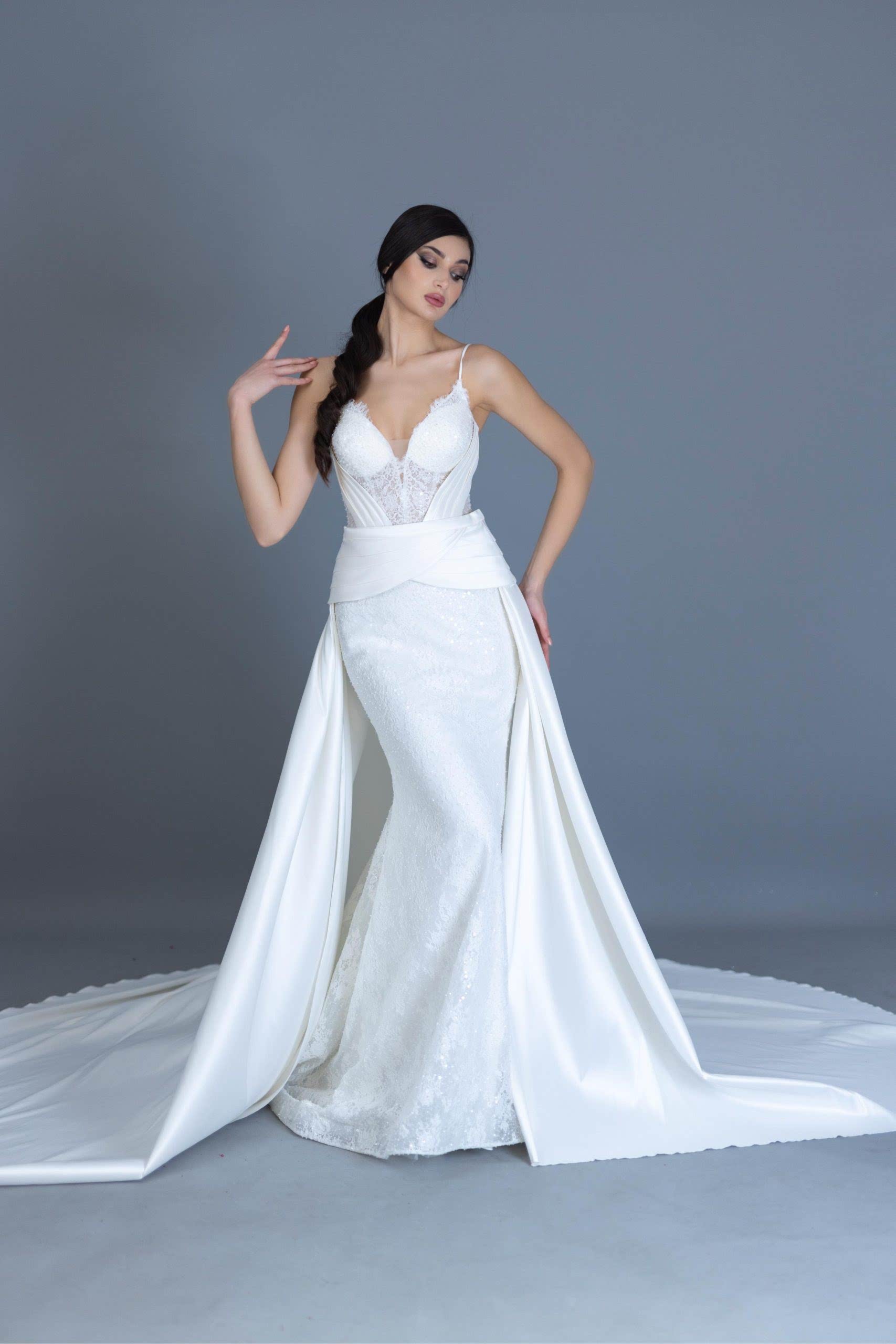 Zarif dantel dokusu ve ince askılı tasarımıyla feminen bir siluet sunan Demonte Balık Gelinlik, vücuda oturan kesimiyle göz alıcı bir duruş sergiliyor. Çıkarılabilir kuyruk detayı sayesinde hem sade hem gösterişli iki farklı görünüm sunarak düğün gününüzde esneklik ve stil bir arada.