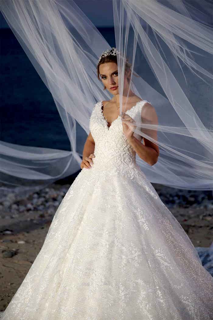 Üst bölümde yoğunlaşan boncuk işlemelerin büyüleyici etkisi A kesim gelinliğin bütününü etkiliyor. Yoğun el işçiliğinin hissedildiği gövde belin inceliğine vurgu yaparak etek bölümüne doğru yerini ışıltılı tüle bırakıyor. Tül üzerine özenle serpiştirilen yapraklı işlemeler, etek uçlarına kadar devam ederek sonsuzluğu çağrıştırıyor. Geniş V yaka ve tam omuzda biten sıfır kol, omuzları ön plana çıkartarak zarafeti simgeliyor.