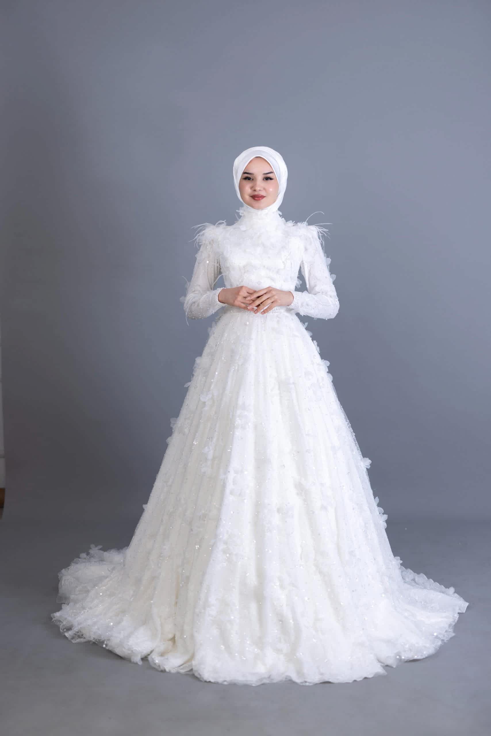 Zarif otriş detayları ve helen kesimiyle tasarlanmış bu 3 boyutlu çiçekli tesettür gelinlik, modern dokunuşlarla şıklığı birleştiriyor. Her bir çiçek detayı, gelinliğin üzerine özenle işlenmiş ve üç boyutlu yapısıyla göz alıcı bir etki yaratıyor.