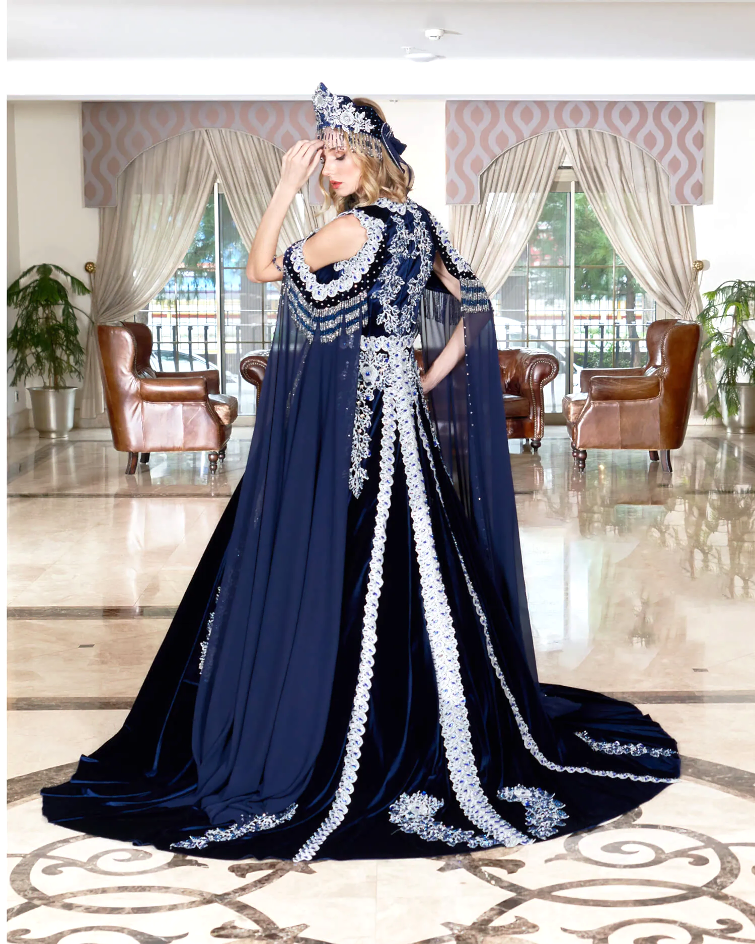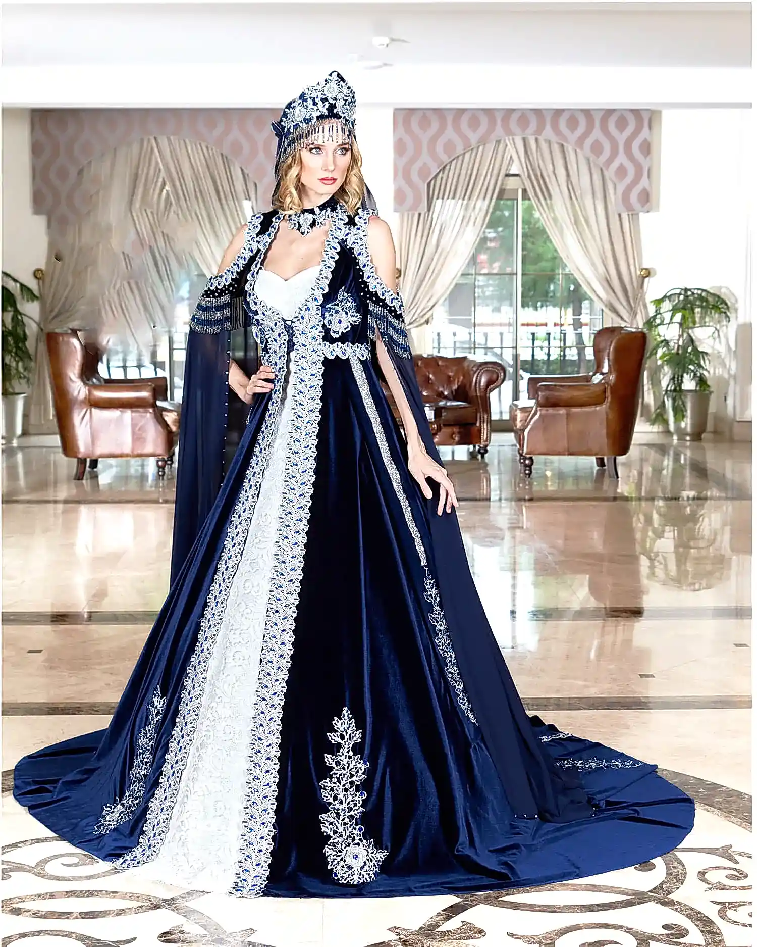 Beyaz Lacivert Kabarık Uzun Kaftan Bindallı:27+ yıllık tecrübemiz ve binlerce model zarafetiyle, her detayda özen ve ustalık barındıran bu eşsiz tasarım, ölçülerinize özel işçilikle hayalinizdeki anlara eşlik ediyor. Müşteri desteğimiz ve taksitli ödeme kolaylıklarımızla, A’dan Z’ye kusursuz bir deneyim Yeşim Gelinlik’te sizleri bekliyor!