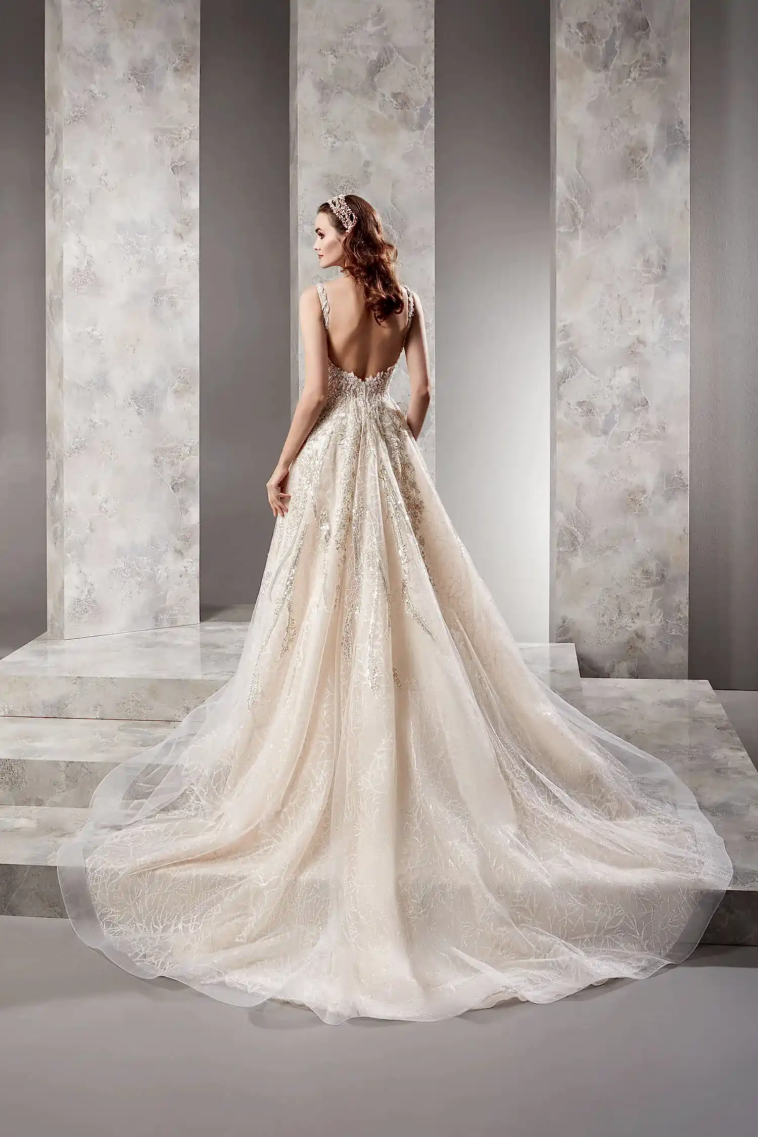 Kare Yaka Nude Renkli Gümüş İşlemeli Pileli Helen Gelinlik