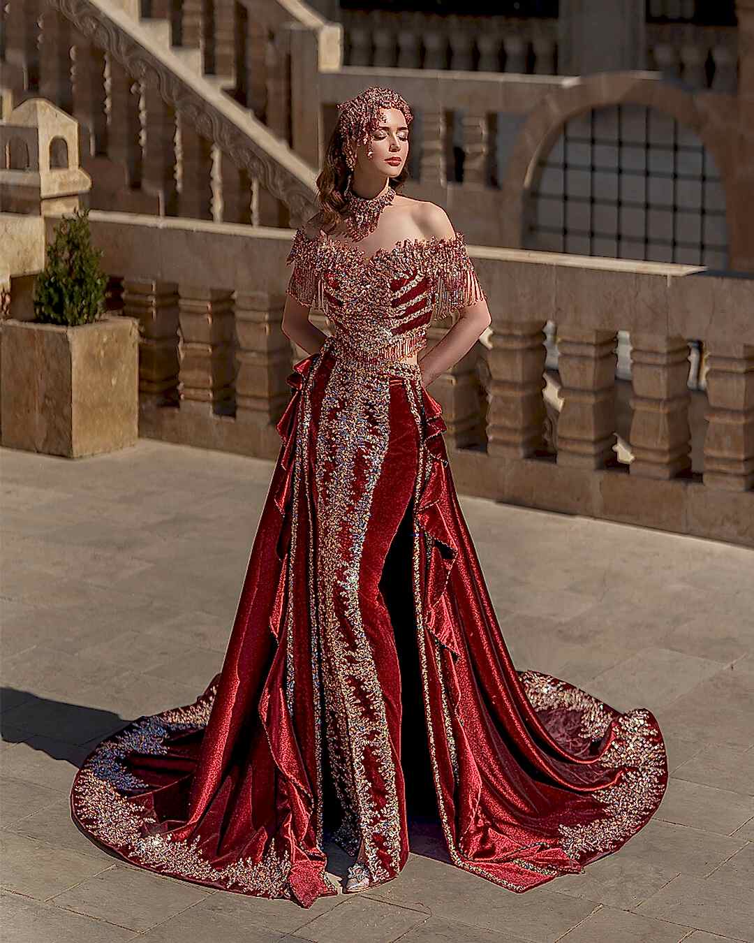 Kırmızı taş işlemeli, Madonna yaka, balık demonteli iki parça bindallımızla kına gecenizde zarif ve şık bir görünüm elde edin. Göz alıcı detayları ve şıklığı ile bu model, gelin hanımların kına gecesinde tercih edeceği en özel seçeneklerden biri olacak. Unutulmaz anlar yaşamak için bu muhteşem bindallı ile fark yaratın!