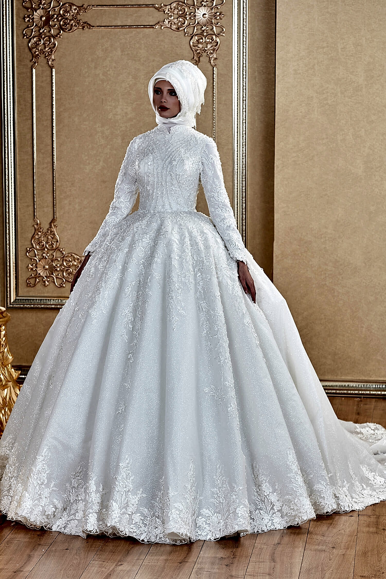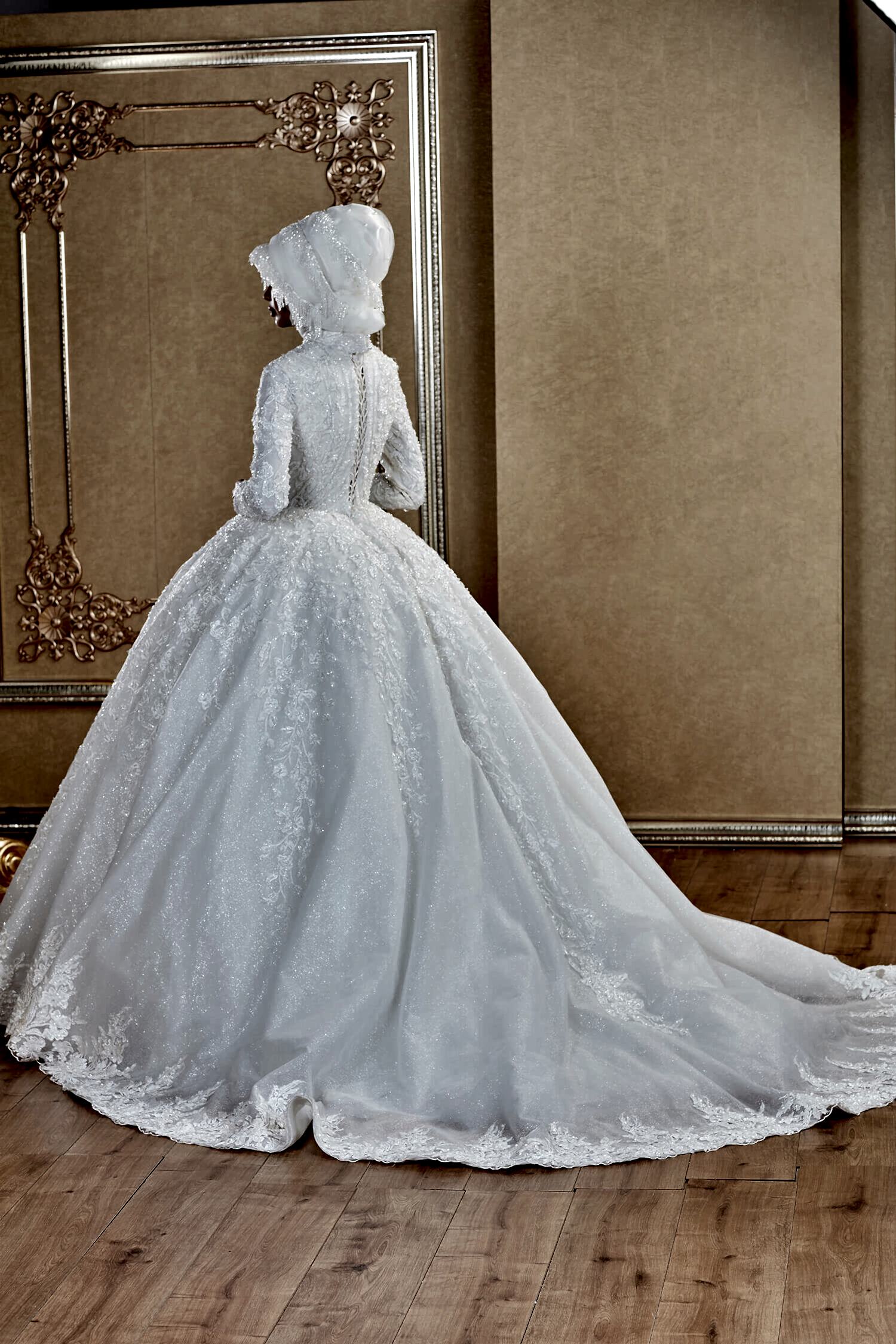 Kristal İşlemeli Hakim Yaka Dantelli Prenses Tesettür Gelinlik