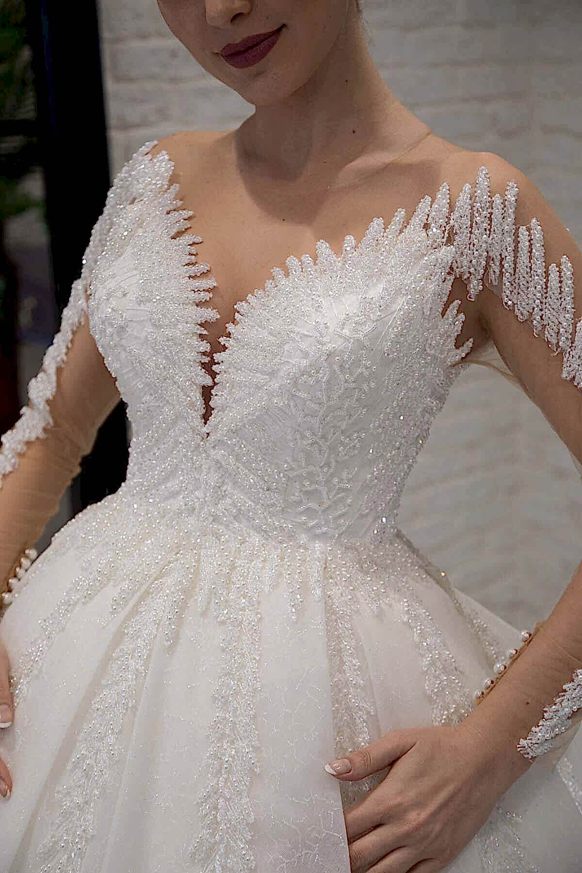 Kristal Taş İşlemeli Kol Dekolteli A Kesim Gelinlik