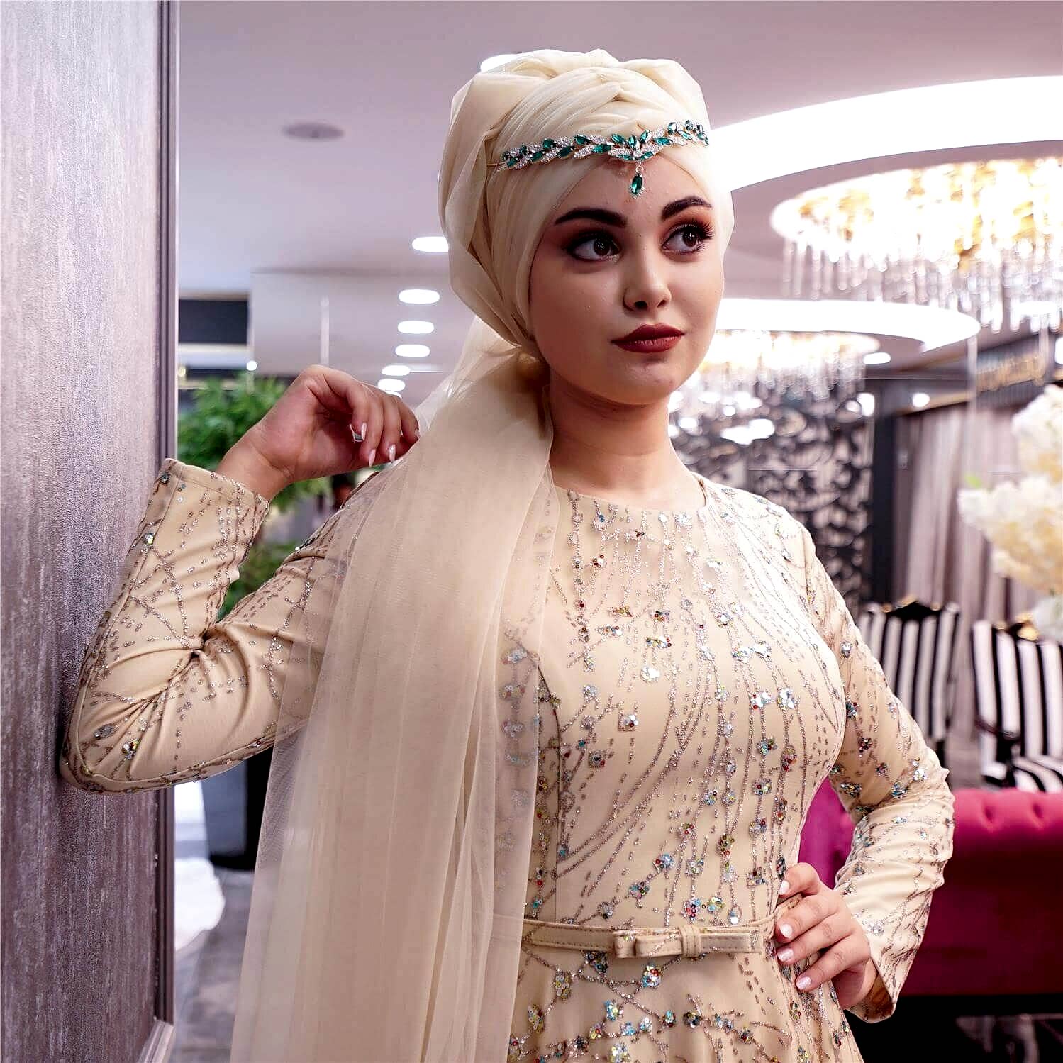 Kristal Taş İşlemeli Krem Tesettür Abiye Elbise:27+ yıllık tecrübemiz ve binlerce model zarafetiyle, her detayda özen ve ustalık barındıran bu eşsiz tasarım, ölçülerinize özel işçilikle hayalinizdeki anlara eşlik ediyor. Müşteri desteğimiz ve taksitli ödeme kolaylıklarımızla, A’dan Z’ye kusursuz bir deneyim Yeşim Gelinlik’te sizleri bekliyor!