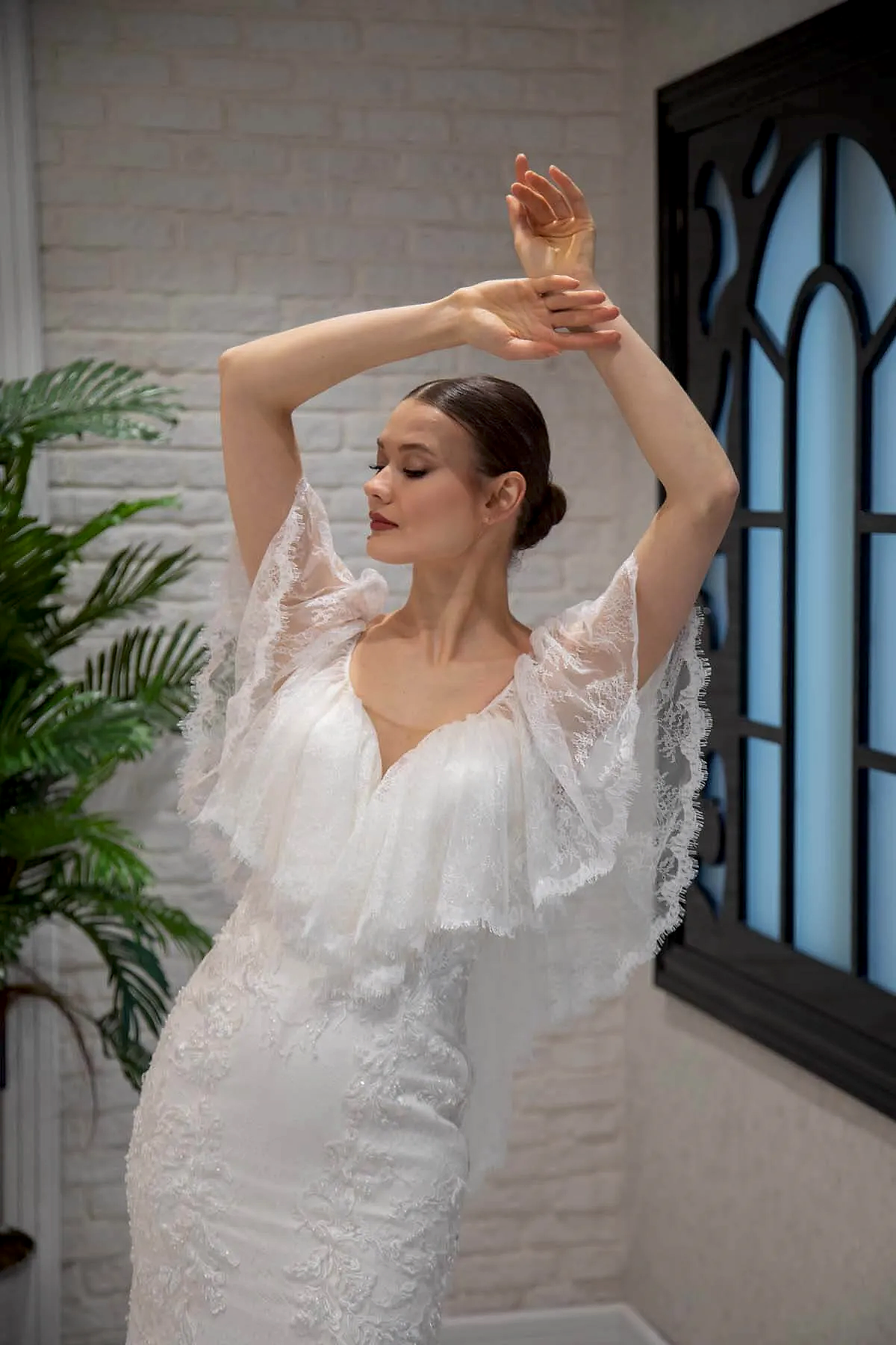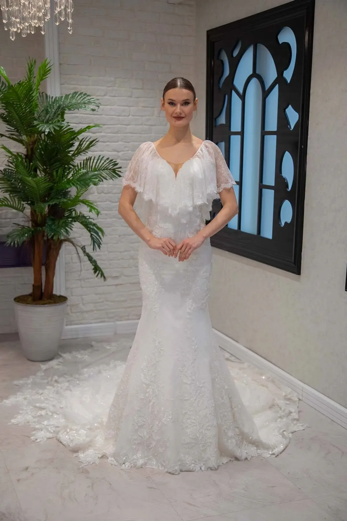 Lace and Tulle Embroidered V-Neck Mermaid Wedding Dress:27+ yıllık tecrübemiz ve binlerce model zarafetiyle, her detayda özen ve ustalık barındıran bu eşsiz tasarım, ölçülerinize özel işçilikle hayalinizdeki anlara eşlik ediyor. Müşteri desteğimiz ve taksitli ödeme kolaylıklarımızla, A’dan Z’ye kusursuz bir deneyim Yeşim Gelinlik’te sizleri bekliyor!