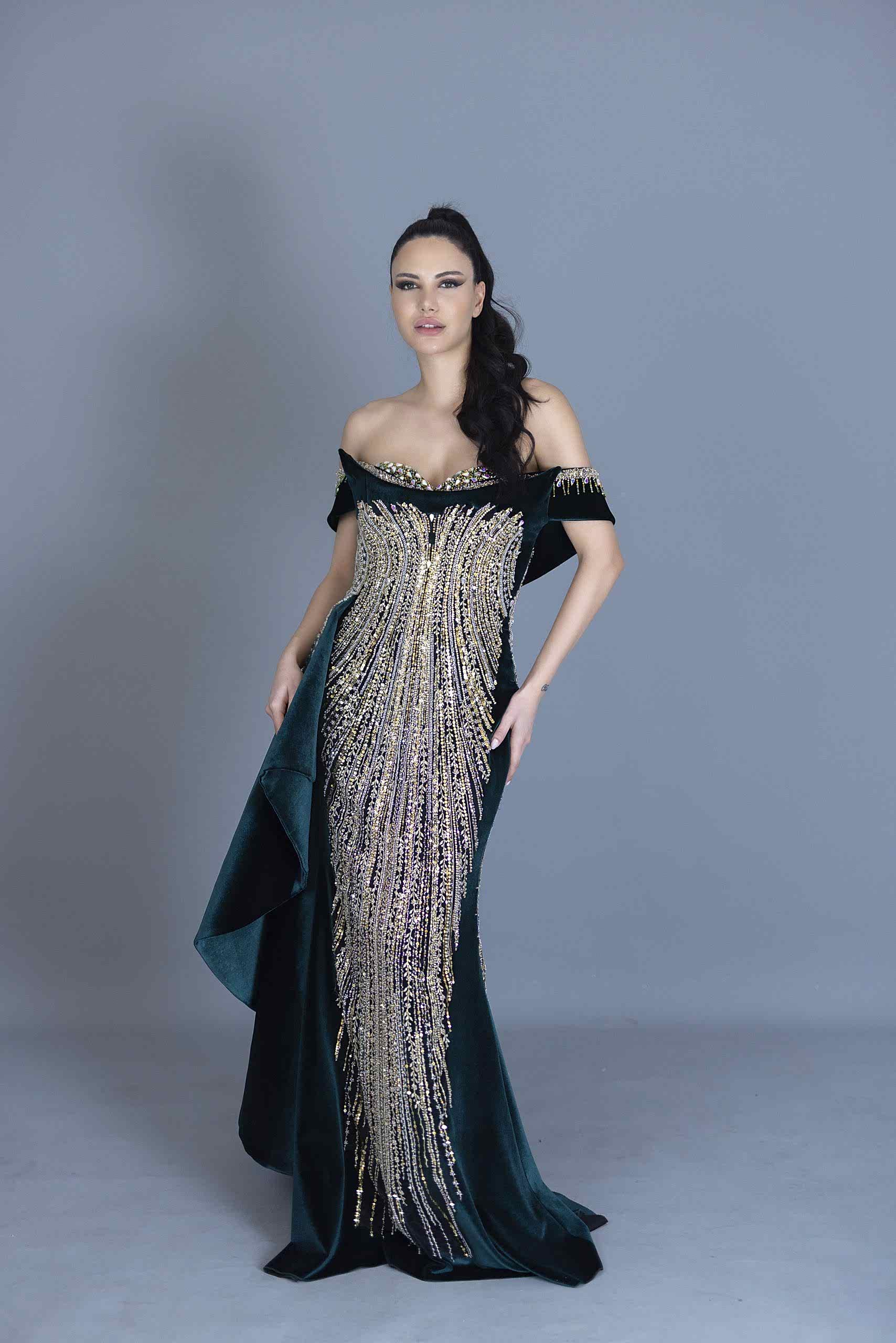 Tek parça formuyla zarafeti yansıtan bu bindallı, gösterişli taş işlemeleri, madonna yaka kesimi ve vücut hatlarını öne çıkaran korse detayıyla geleneksel şıklığı modern bir siluetle buluşturuyor.