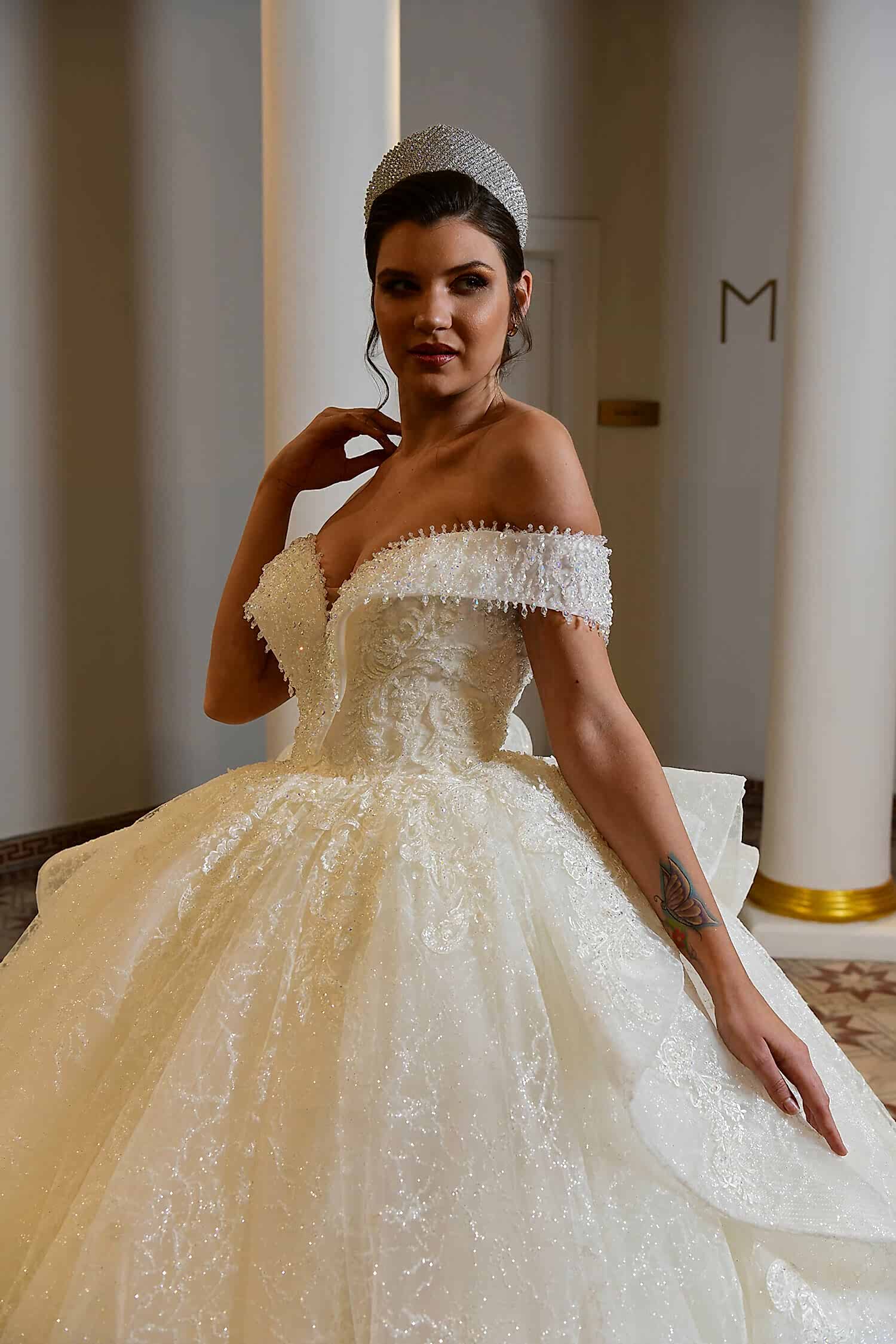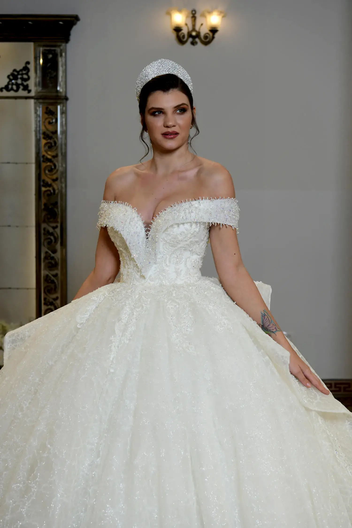 Madonna Yaka Kristal İşlemeli Volan Etek Detaylı Prenses Gelinlik