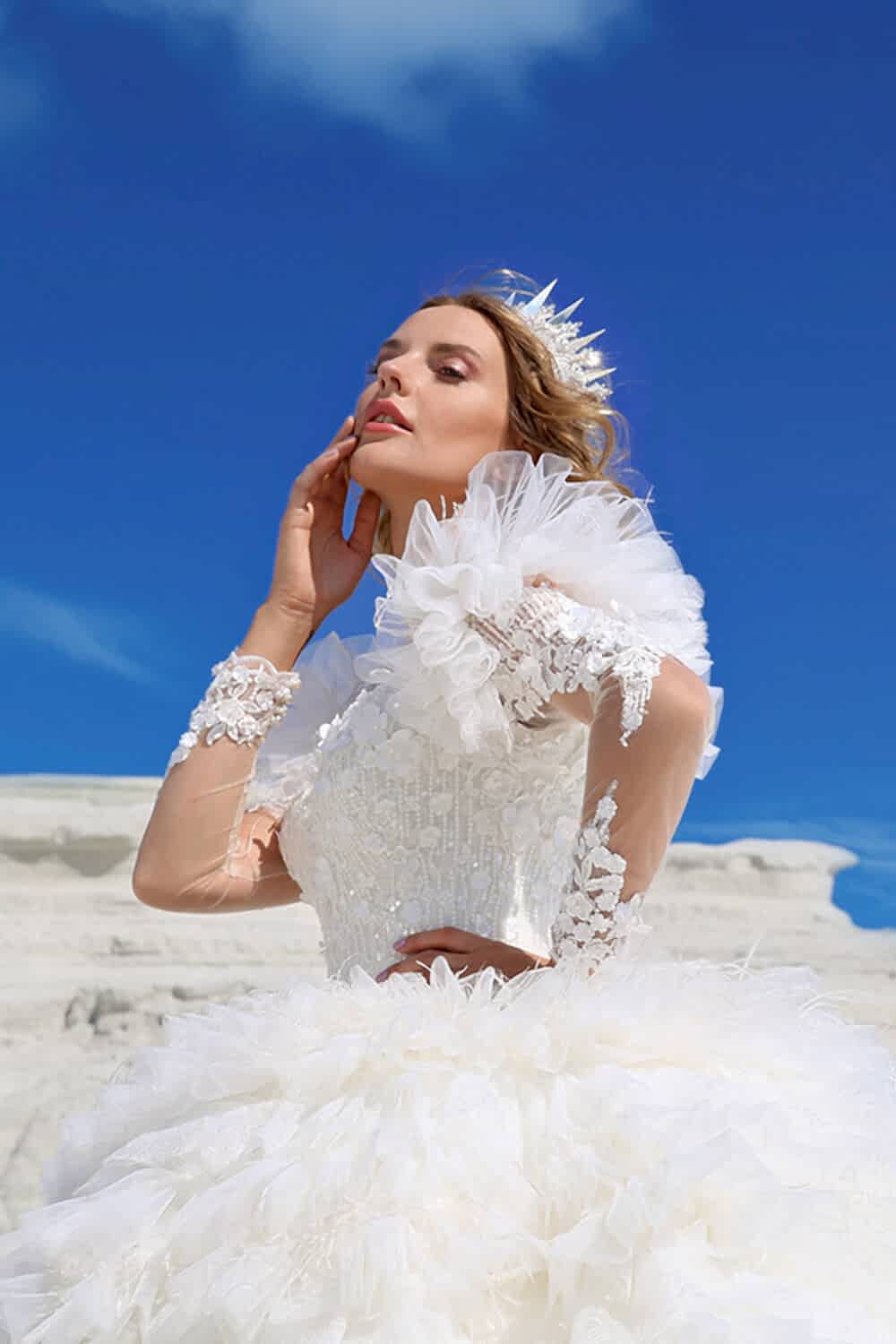 Omuz Detaylı V Yaka Transparan Kol Kat Kat Prenses Gelinlik:27+ yıllık tecrübemiz ve binlerce model zarafetiyle, her detayda özen ve ustalık barındıran bu eşsiz tasarım, ölçülerinize özel işçilikle hayalinizdeki anlara eşlik ediyor. Müşteri desteğimiz ve taksitli ödeme kolaylıklarımızla, A’dan Z’ye kusursuz bir deneyim Yeşim Gelinlik’te sizleri bekliyor!
