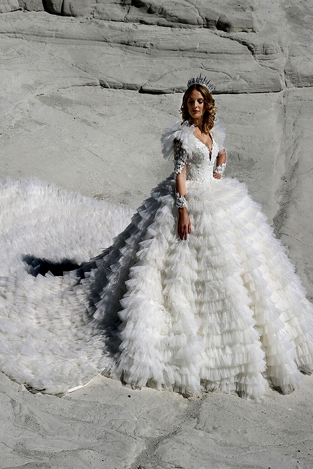 Omuz Detaylı V Yaka Transparan Kol Kat Kat Prenses Gelinlik