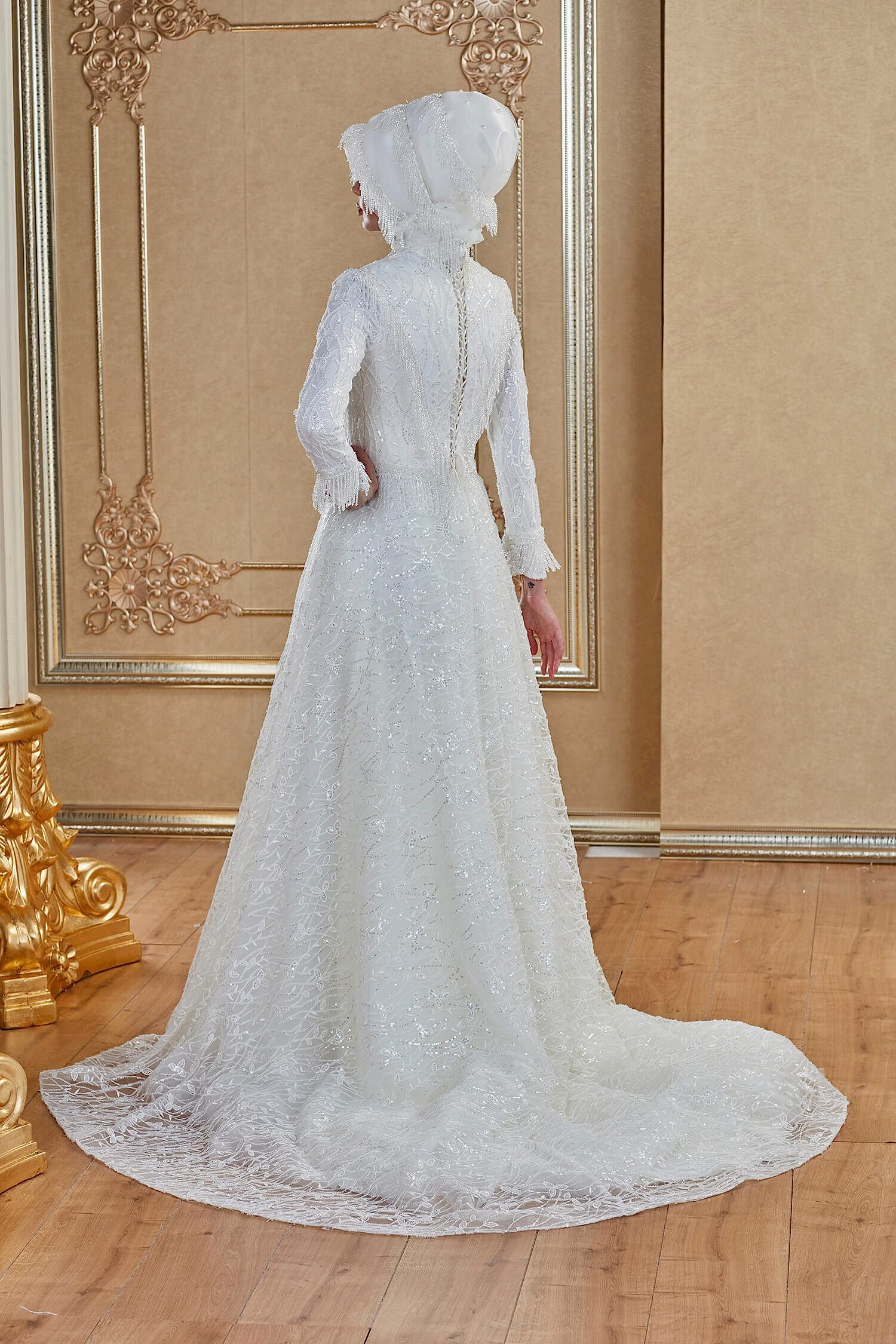 Payet İşlemeli Boncuk Sarkaç Detaylı Helen Tesettür Gelinlik