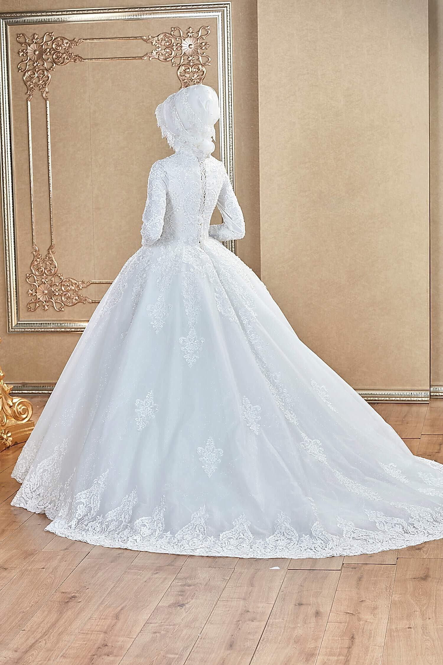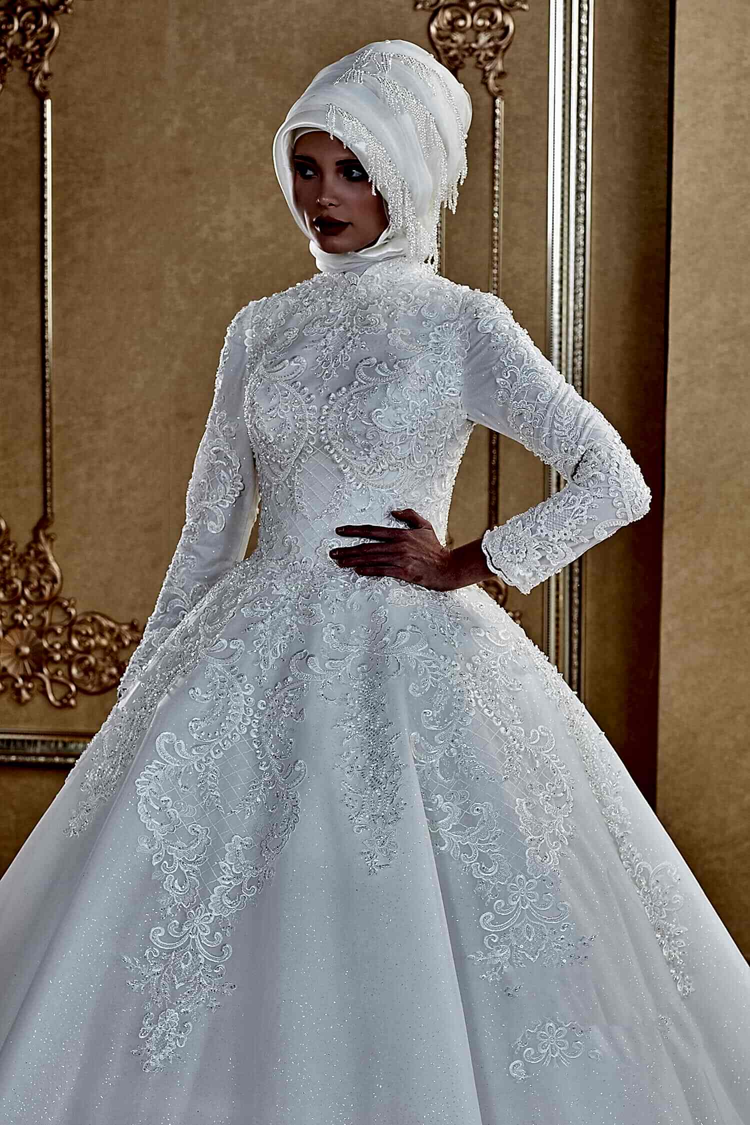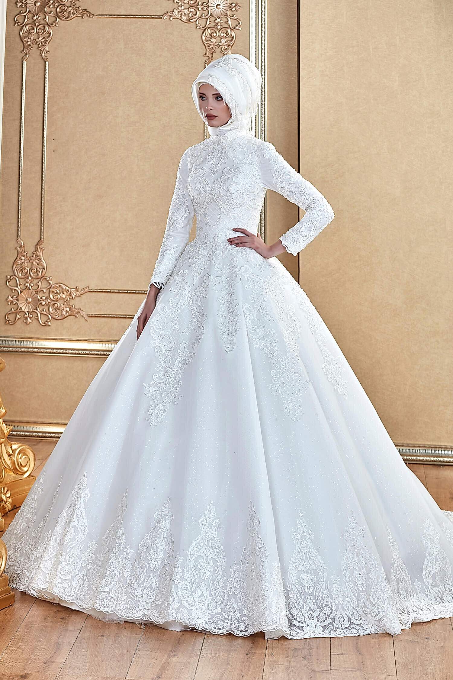 Simli Tül Üzeri Dantel İşlemeli A Kesim Tesettür Gelinlik