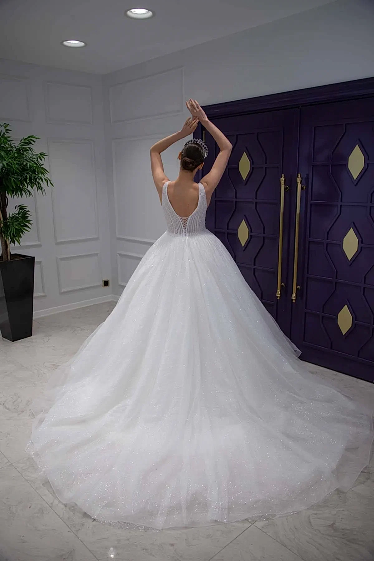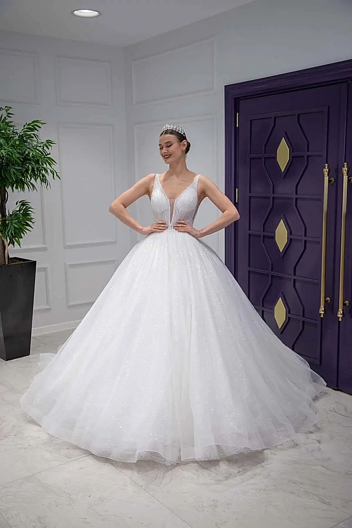 Taş İşlemeli Derin V Yaka Prenses Gelinlik Modeli