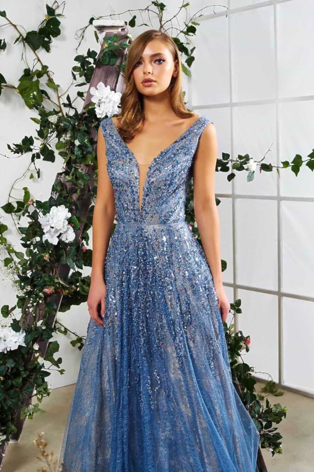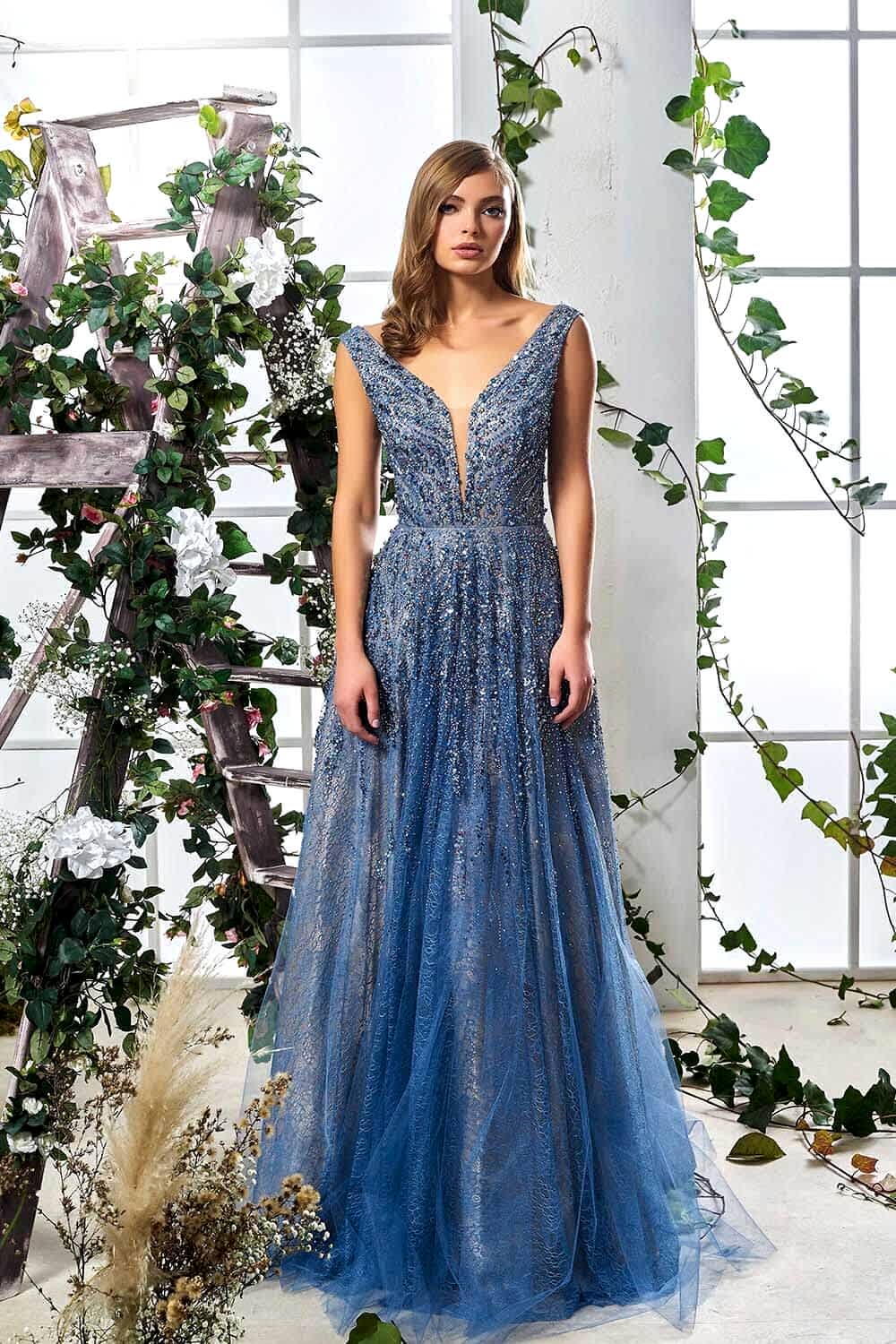 Taş İşlemeli V Yaka Uzun Mavi Abiye Elbise