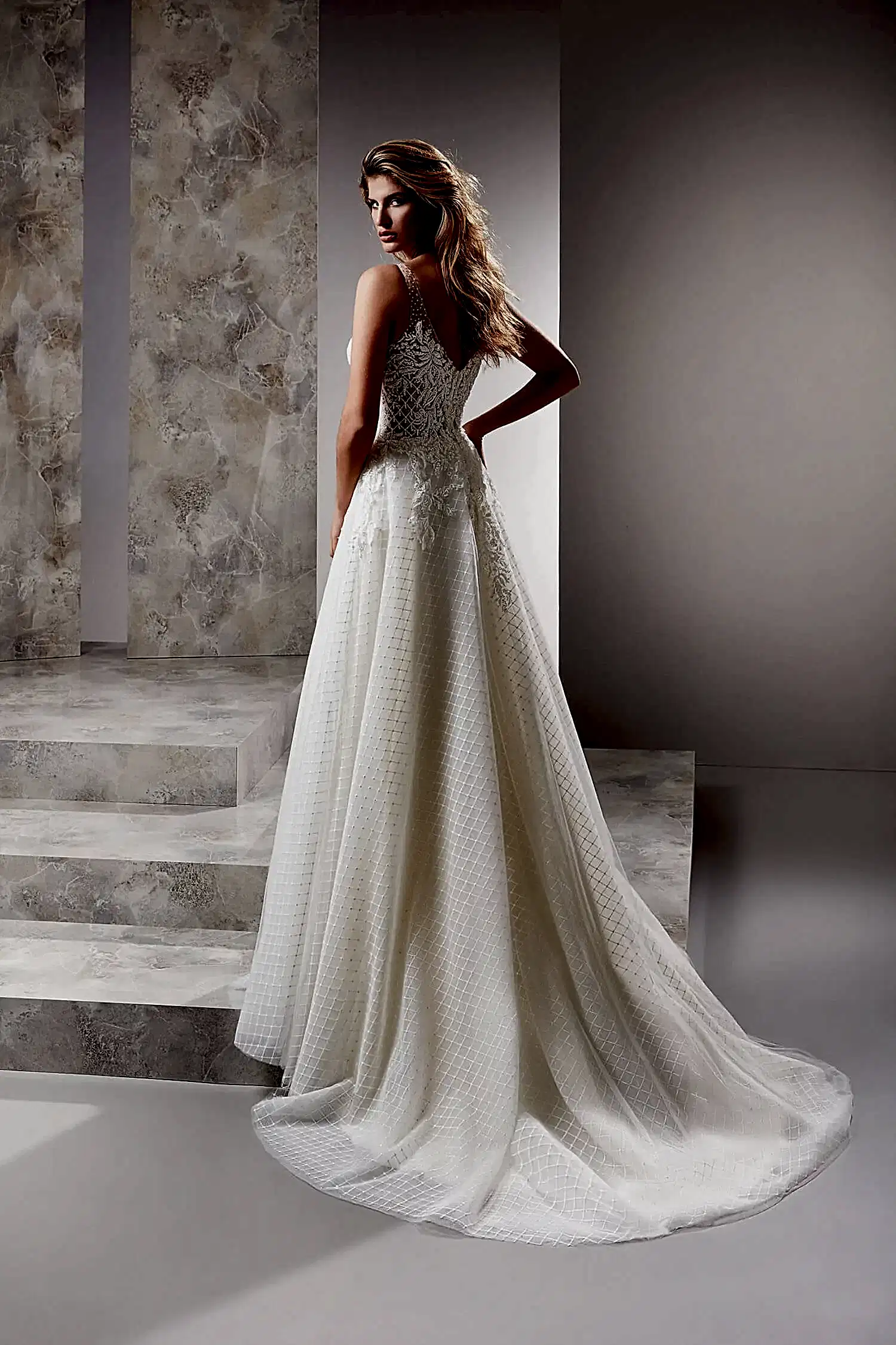 Tulle Straps V-Neck Deep-Decollete Plaid Tulle Helen Wedding Dress
