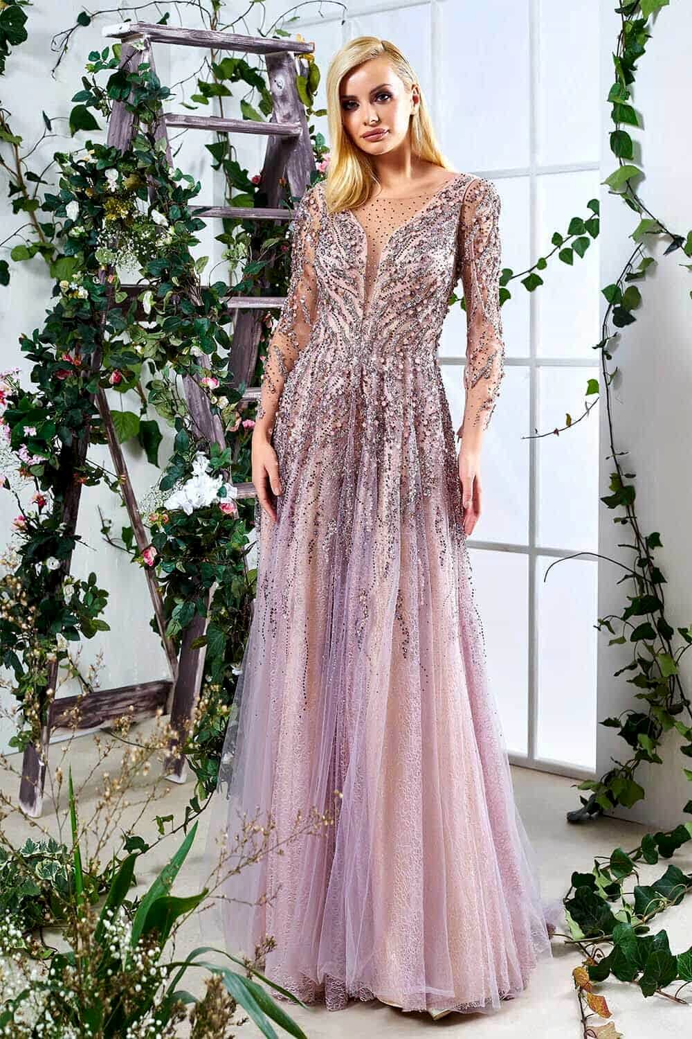 V Yaka Kloş Etekli Taş İşlemeli Uzun Kollu Pembe Abiye Elbise