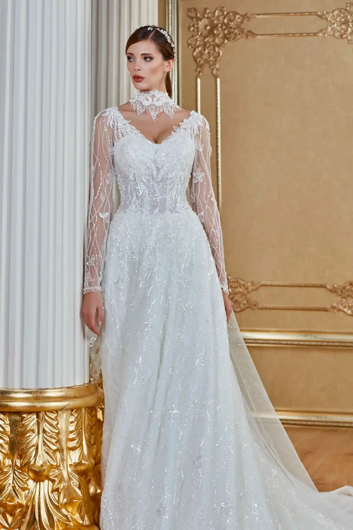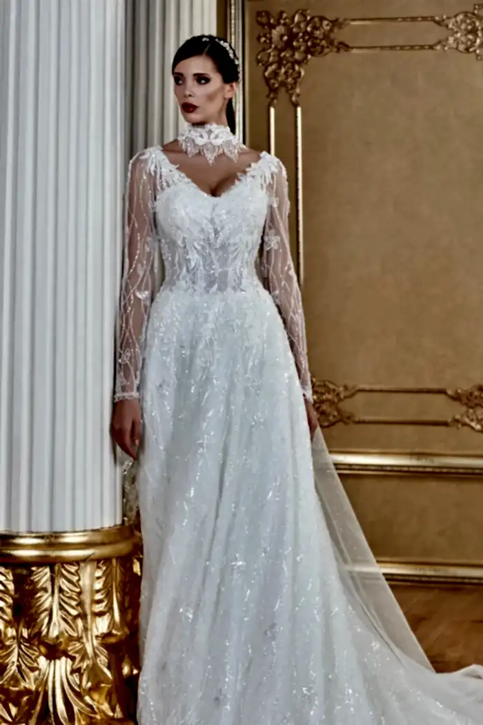 V Yaka Uzun Kol Gerdanlık Detaylı Korseli Helen Gelinlik