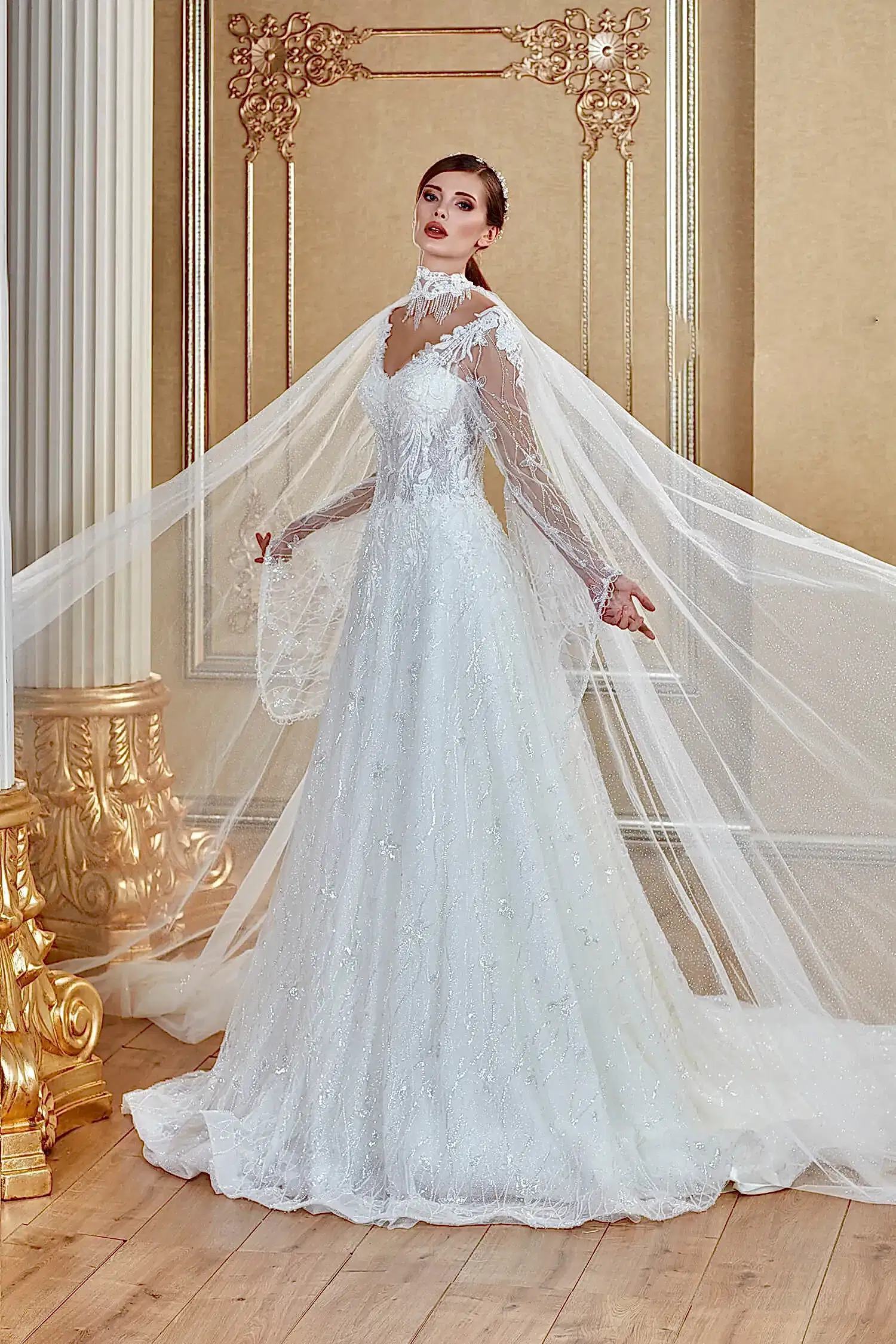 Cesur ve feminen bir duruş vadeden transparan uzun kollu Helen gelinlik. V yakası ve derin sırt dekoltesiyle cezbedici bir havaya sahip. İsteğe bağlı olarak takılıp çıkarılabilen Gerdanlık görünümlü pelerin detayı sayesinde bir modelde iki farklı görünüm sunuyor. Klasiklere sadık kalan rengi ve ışıltılı tül eteği ve nefes kesici zarifliğiyle cesur gelinlerin gözdesi olmaya aday.