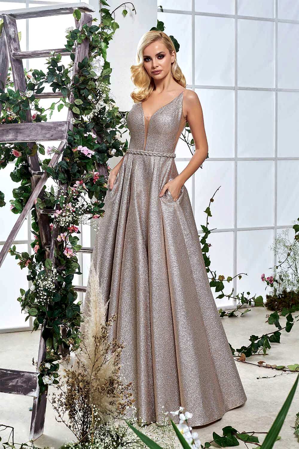 V Yakalı Kloş Etekli Uzun Abiye Elbise