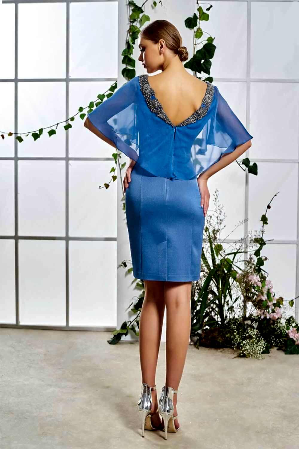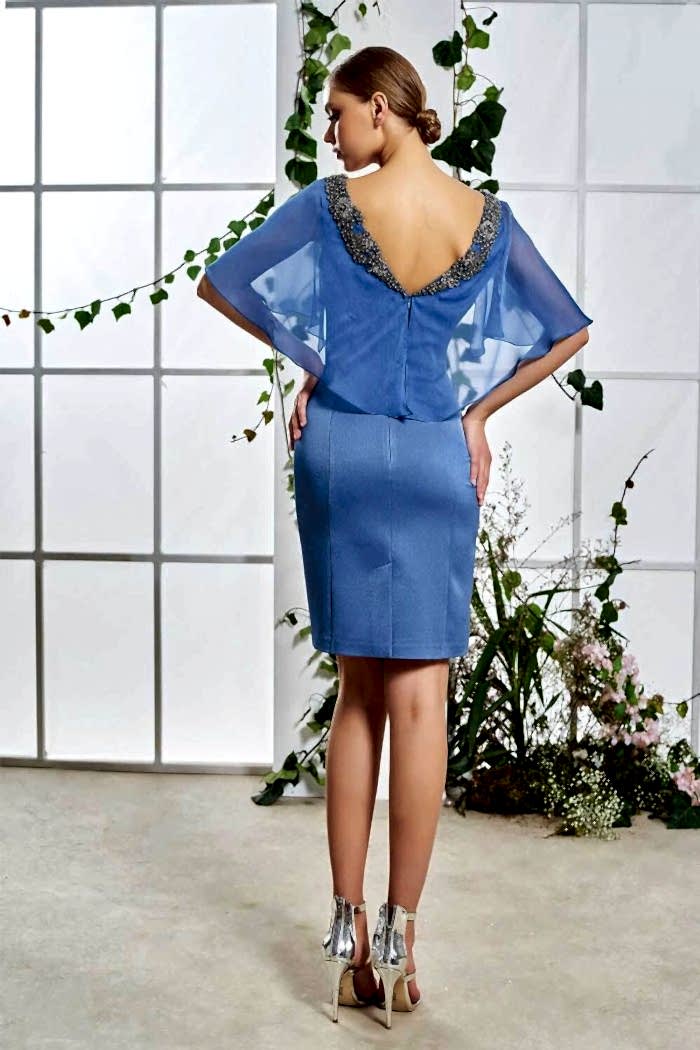 Yarım Tül Kol Derin V Yaka Mavi Kısa Abiye